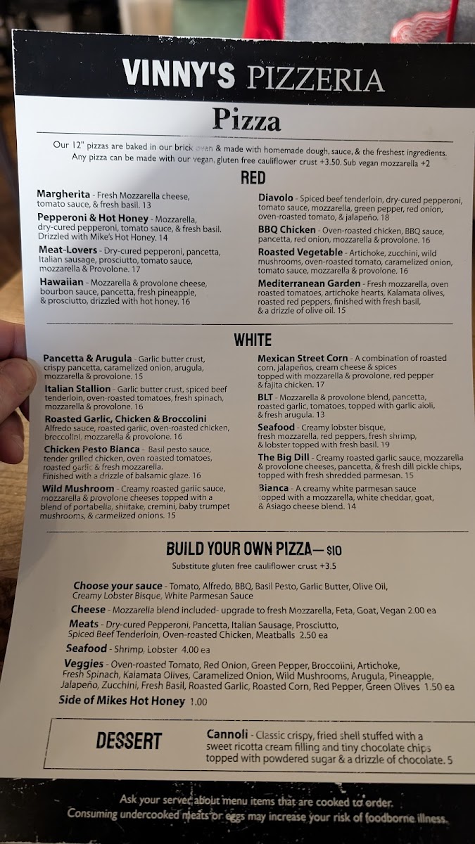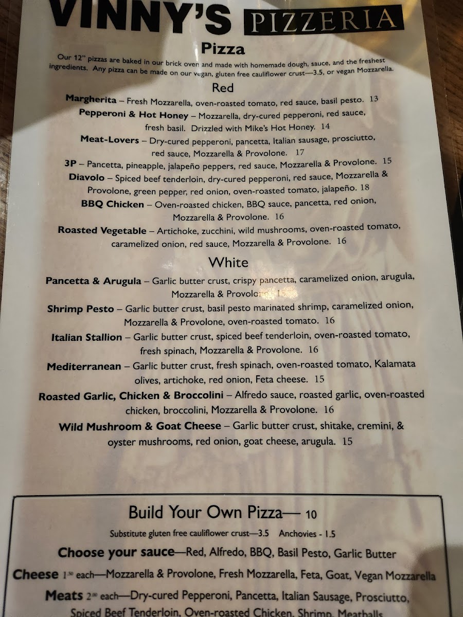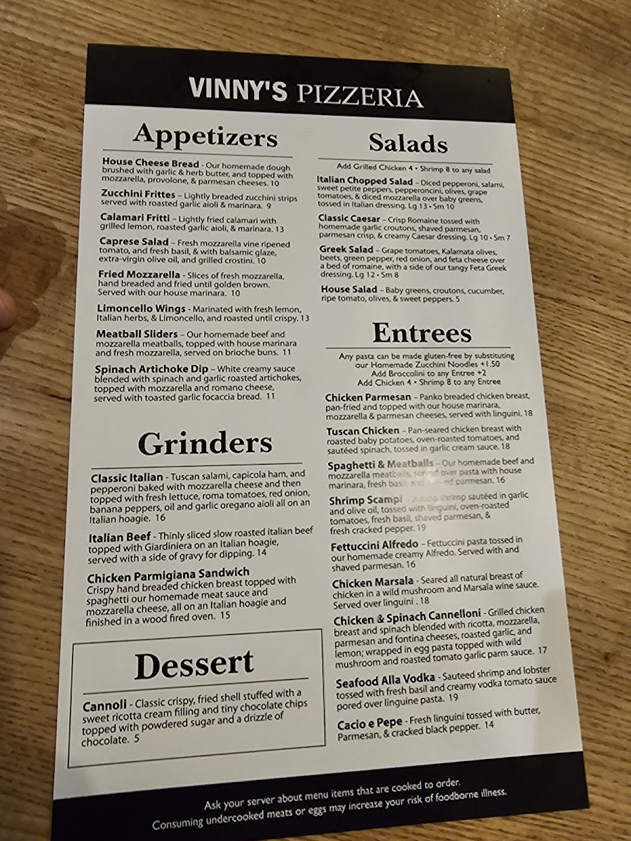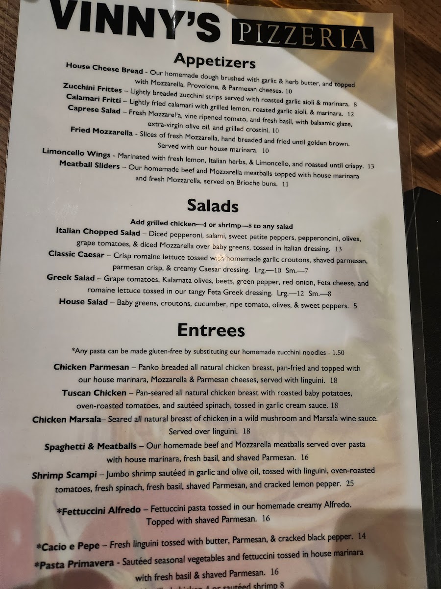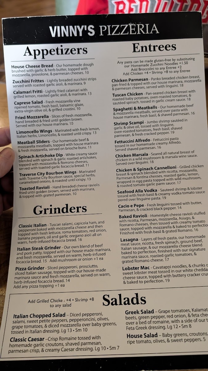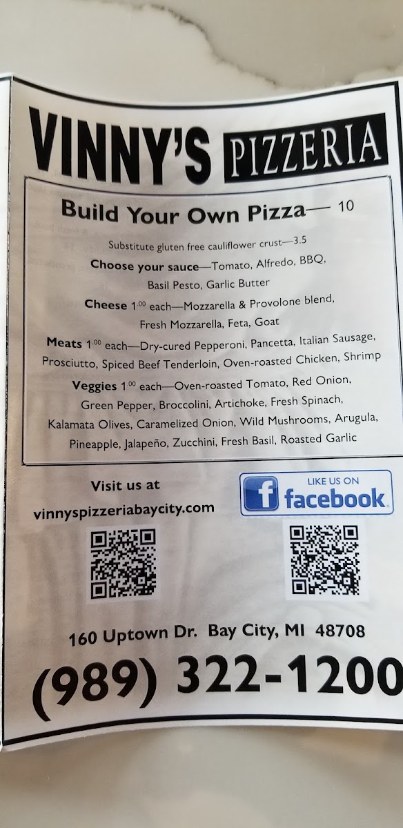 If you're craving delicious, classic Italian flavors, look no further than Vinny's Pizzeria Menu. Located at 160 Uptown Dr in Bay City, MI, this cozy spot has a wide selection of mouth-watering dishes that are sure to hit the spot. Whether you're in the mood for a cheesy, crispy pizza loaded with fresh toppings or a hearty pasta dish, Vinny’s has something for everyone. You can’t go wrong with their signature pies, each made with top-quality ingredients and baked to perfection. Their pasta offerings are just as satisfying, from rich and creamy Alfredo to savory marinara. And don’t forget about the sides - from garlic knots to crisp salads, each dish is crafted to complement your meal. Whether you're stopping in for a quick bite or enjoying a leisurely dinner with friends, the variety and flavors on the menu will have you coming back time and time again.